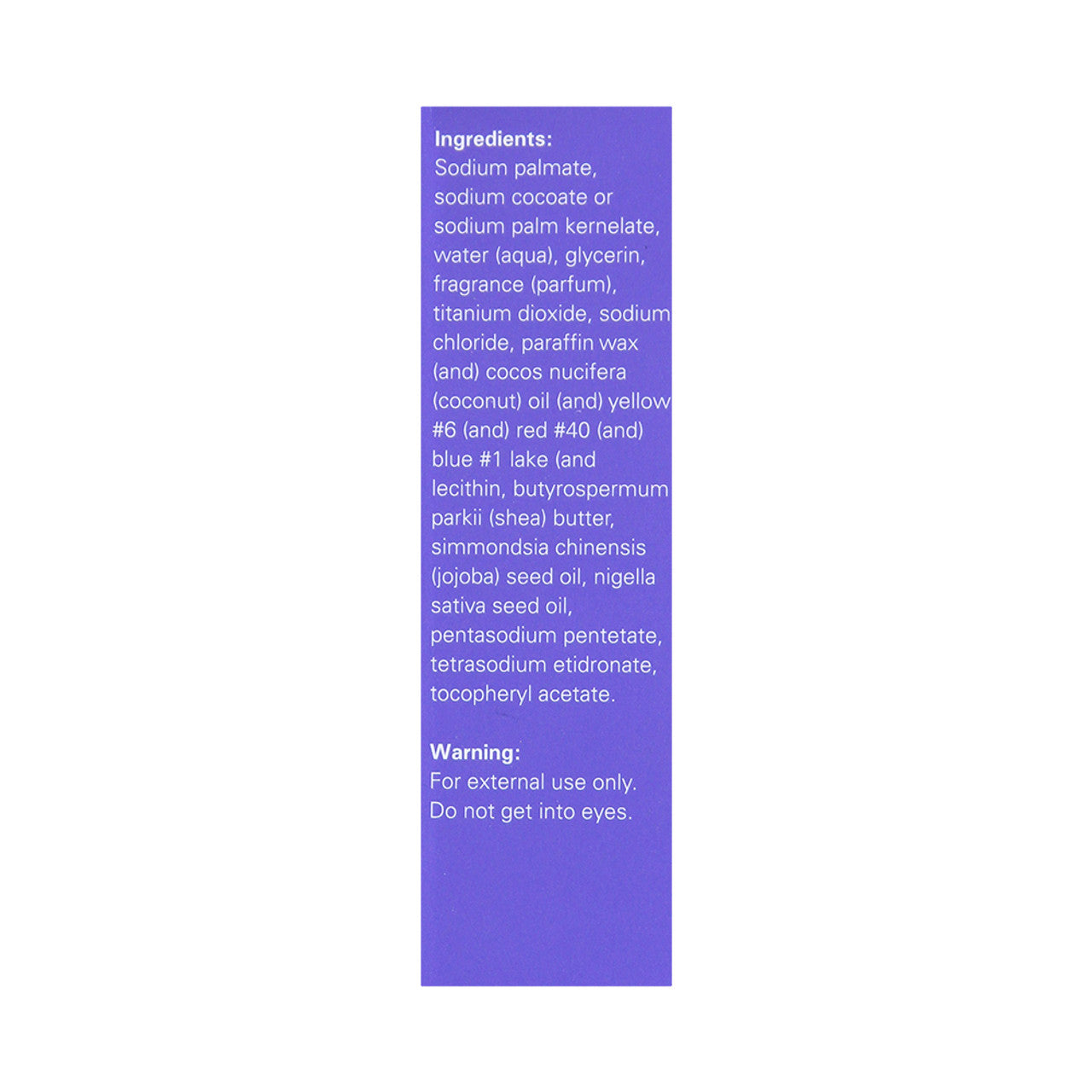 Sodium Palmate, Sodium Cocoate/Sodium Palm Kernelate, Water(Aqua), Glycerin(Vegetable), Fragrance, Sodium Chloride, Titanium Dioxide(CI 77891), Jojoba Esters, Shea Butter, Black Seed Oil, Pentasodium Pentetate, Tetrasodium Etidronate, Tocopheryl Acetate, Iron Oxide (CI 77499)