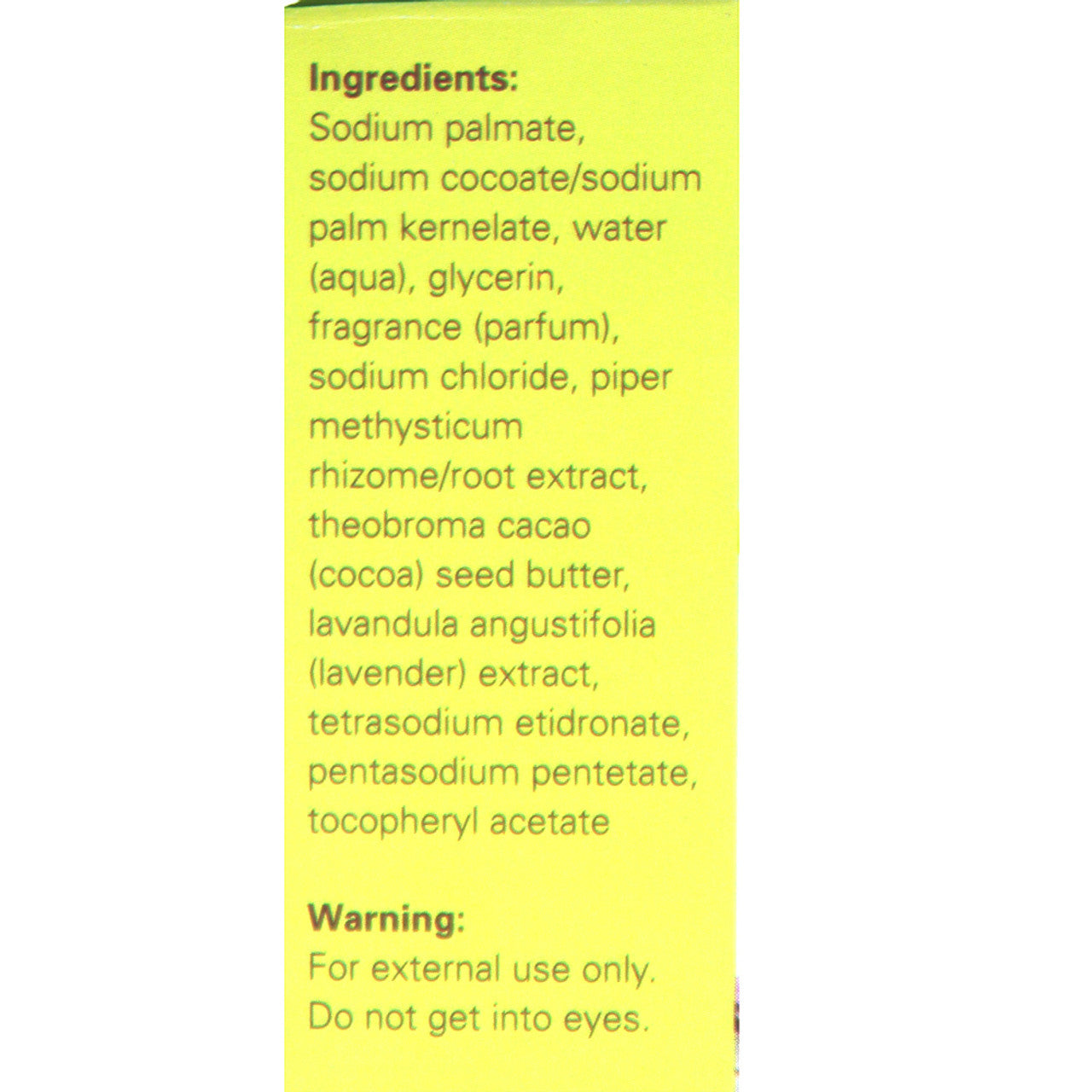 Sodium palmate, Sodium Cocoate/Sodium Palm Kernelate, Water, Vegetable Glycerin, Fragrance, Sodium chloride, Lavandula angustifolia (Lavender) extract, Piper methysticum rhizome/root extract( Kava Kava Extract) , theoborma cacao (Cocoa) seed butter, tetrasodium etidronate, pentasodium pentetate, Tocopheryl acetate.